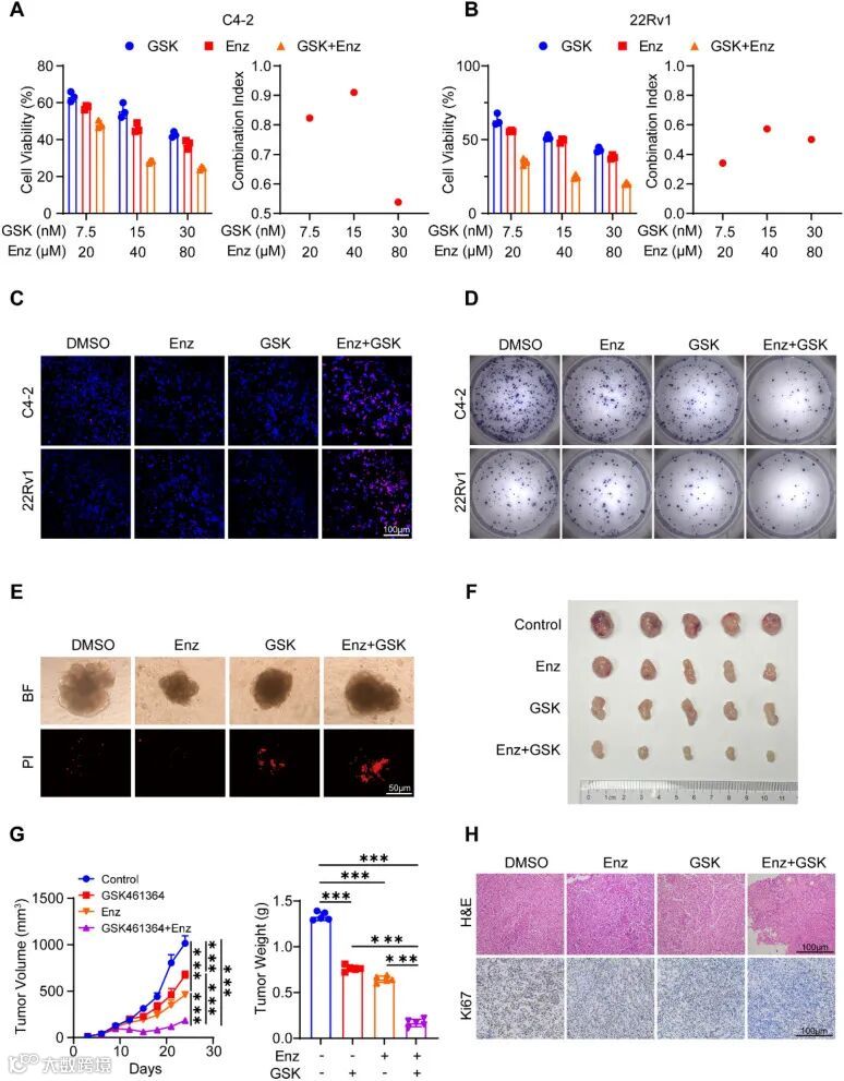 图6.GSK461364与恩杂鲁胺的协同抗肿瘤效应。