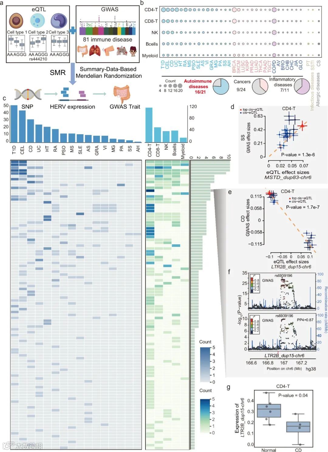 本研究首先利用981名健康供体的PBMC单细胞数据,构建HERV分析流程;然后,结合表观遗传数据,发现细胞类型特异性HERV受表观遗传状态调控;通过eQTL分析探究HERV表达与顺式区域内SNPs的关联。最后,整合GWAS数据,通过SMR分析HERV与自身免疫疾病的关系,并对特定关联(HERV和克罗恩病)进行了验证。