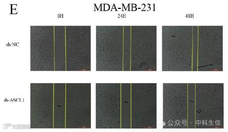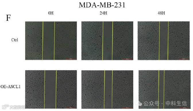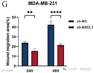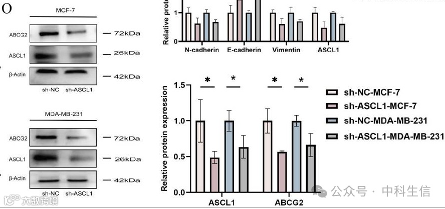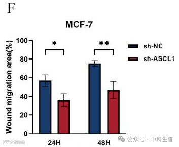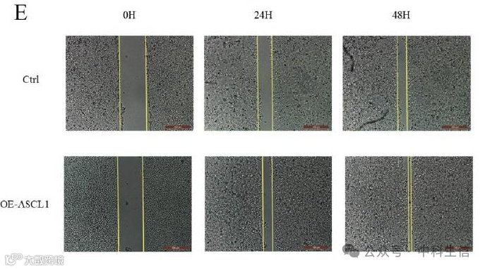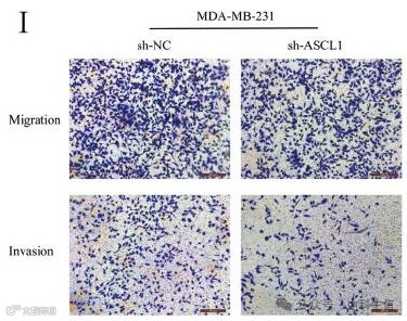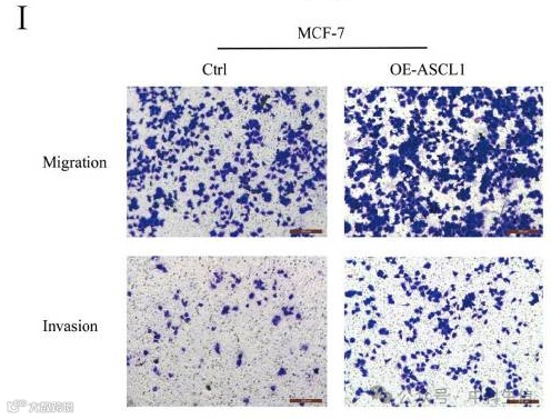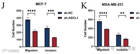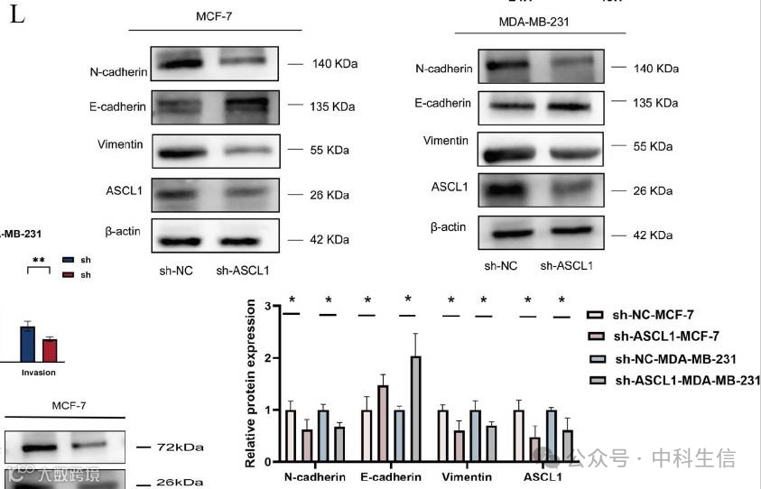 鉴于上皮间充质转化(epithelial-mesenchymal transition, EMT)在促进细胞迁移中的关键作用,本研究进一步分析了 ASCL1 与 EMT 之间的关系。Western blot 结果证实,ASCL1 抑制可抑制 EMT 过程,从而减少BC细胞的迁移和侵袭能力(图 6L)。