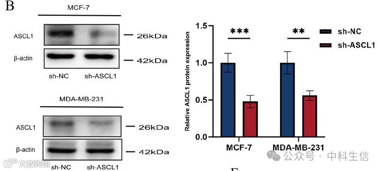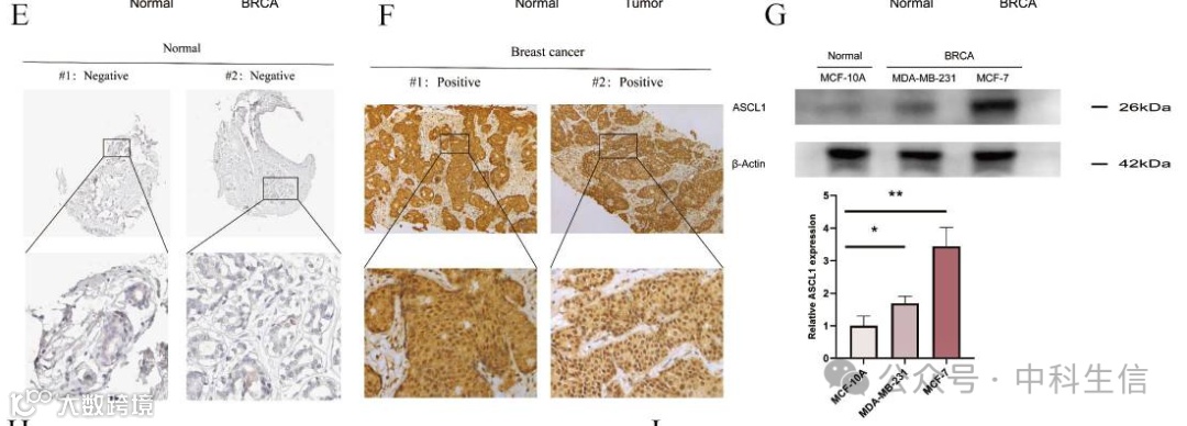 进一步研究 ASCL1 的蛋白质表达水平也得到了相似的趋势。HPA 数据库的免疫组化数据显示,ASCL1 在正常乳腺组织中几乎检测不到(图 1E),而在BC样本中则呈现强阳性表达(图 1F)。Western blot 分析进一步证实了这一结果,显示 ASCL1 在BC细胞中的蛋白表达水平显著高于正常乳腺上皮细胞(图 1G)。这些结果一致表明 ASCL1 在BC中呈现高表达。