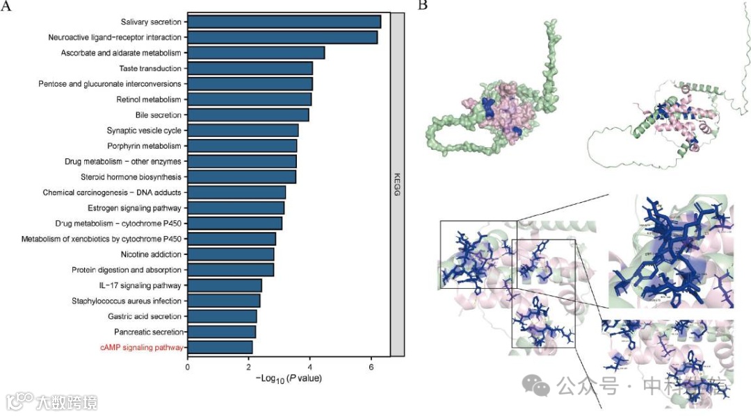 为了进一步探究 ASCL1 调控铁死亡的分子机制,本研究在 TCGA-BRCA 队列的 ASCL1 高表达组与低表达组之间筛选出了 474 个差异表达基因,其中 248 个基因上调,226 个基因下调,并通过 KEGG 通路分析(|log2FC| > 1,调整后 P < 0.05)发现 ASCL1 可能与 cAMP 信号通路相关(图 8A)。通过生物信息学分析,最终确定了 cAMP 响应元件结合蛋白 1(cAMP-responsive element-binding protein 1, CREB1)为 ASCL1 调控铁死亡的靶基因(补充图 1)。CREB1 是一种磷酸化依赖性转录因子,可调控谷胱甘肽过氧化物酶 4(GPX4)的转录,而 GPX4 是铁死亡的关键抑制因子。因此,ASCL1 可能通过 CREB1/GPX4 轴调控BC细胞的铁死亡。