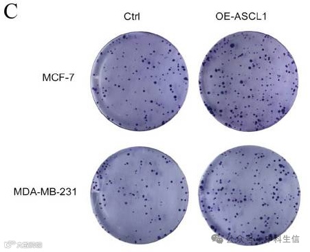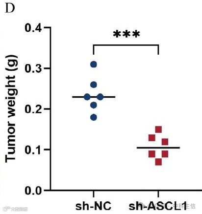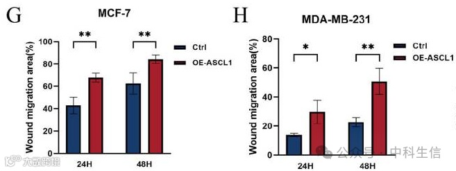本研究进一步评估了 ASCL1 表达水平与BC患者预后的关系。结果表明,ASCL1 高表达的患者,其无复发生存期和总生存期均显著低于 ASCL1 低表达的患者(图 1H, I)。这些结果提示 ASCL1 可能在BC中发挥促癌作用。