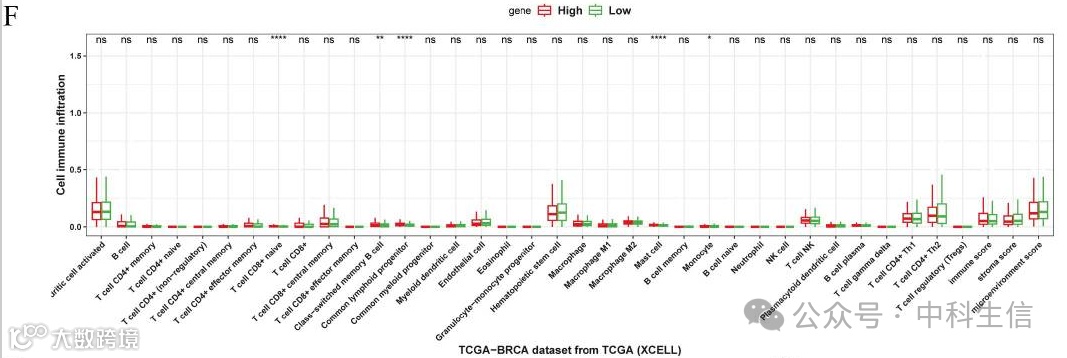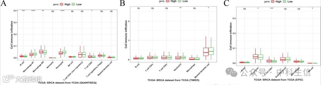 进一步分析 ASCL1 与免疫细胞浸润的关系,采用六种不同的分析方法,将BC患者分为 ASCL1 高表达组和低表达组。结果显示,ASCL1 表达与多种免疫细胞类型相关,包括 B 细胞、调节性 T 细胞(Treg 细胞)、自然杀伤(NK)细胞、CD4+ 和 CD8+ T 细胞、M1 和 M2 巨噬细胞、髓系树突状细胞、中性粒细胞、单核细胞、内皮细胞和肥大细胞(图 4A-F)。值得注意的是,ASCL1 高表达组表现出 M2 巨噬细胞浸润增加,而 M1 巨噬细胞浸润减少。M2 巨噬细胞在恶性肿瘤中已被证实能够促进肿瘤进展并抑制免疫功能(图 4A),这些结果提示 ASCL1 可能在BC免疫逃逸过程中发挥作用。