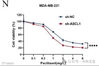 基于上述研究结果,本研究进一步分析了 ASCL1 表达水平与BC化疗药物敏感性的关系,并利用 GDSC 数据库评估了该相关性。对比 ASCL1 高表达组和低表达组,分析了包括多西他赛、紫杉醇、顺铂和阿霉素在内的常用化疗药物的半数抑制浓度(IC50)。结果显示,ASCL1 高表达组的 IC50 值均显著高于低表达组(图 4H-K),表明 ASCL1 高表达可能降低BC对这些化疗药物的敏感性。这一发现提示 ASCL1 可能对BC化疗疗效产生不利影响。