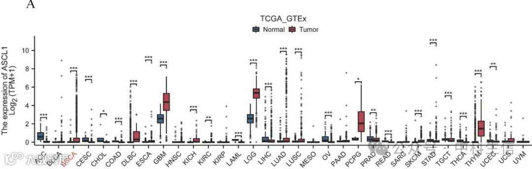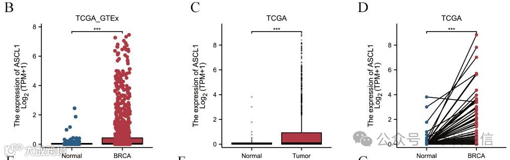 本研究利用 TCGA 和 GTEx 数据库的联合数据分析了 ASCL1 在多种癌症类型中的 mRNA 表达水平,以弥补 TCGA 数据库中缺乏正常组织样本的问题。结果显示,ASCL1 在包括BC在内的多种癌组织中显著高表达(图 1A-B)。进一步,仅使用 TCGA 数据进行分析,发现 ASCL1 在BC组织中的表达仍明显高于正常组织,并通过配对分析得到了相同的结果(图 1C-D)。