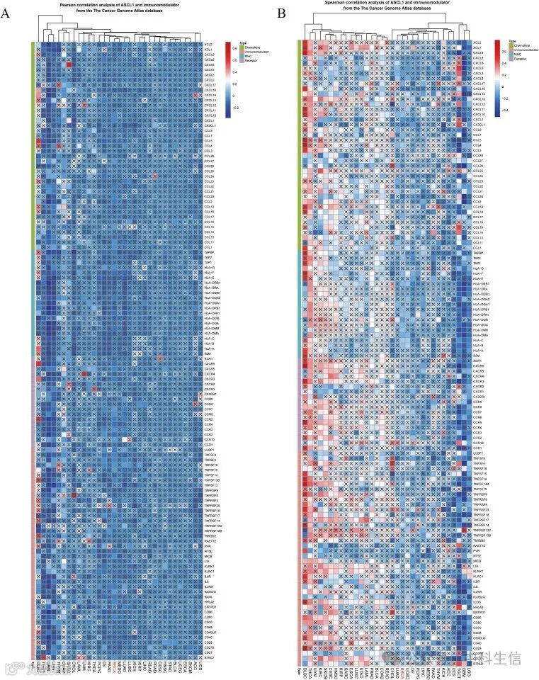 为了探究 ASCL1 高表达对BC的影响,本研究分析了 ASCL1 与肿瘤免疫的关系。肿瘤微环境在调控免疫应答方面发挥着重要作用,因此本研究在多种癌症(包括BC)中评估了 ASCL1 与细胞因子、免疫调节因子、主要组织相容性复合体分子及受体之间的关联。Pearson 和 Spearman 相关性分析均表明 ASCL1 在泛癌背景下与免疫调节因子密切相关(图 3A-B)。在BC中,ASCL1 表达水平与这些因子呈负相关。