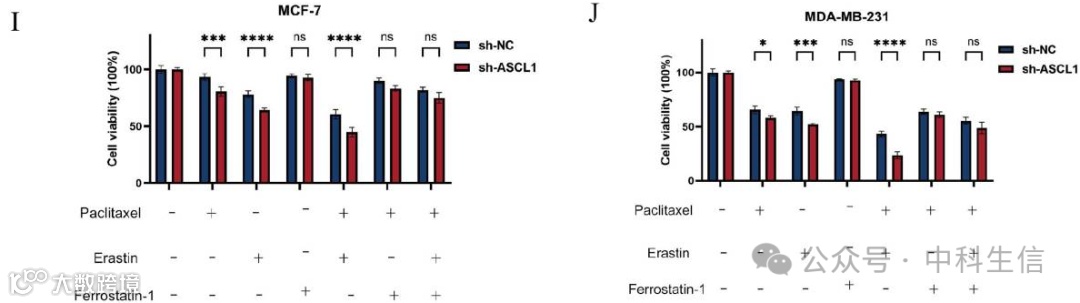 考虑到 ASCL1 抑制可增强BC细胞对紫杉醇的敏感性,本研究进一步探讨了铁死亡是否参与这一过程。CCK-8 结果表明,在紫杉醇单独处理下,sh-ASCL1 BC细胞的存活率显著低于 sh-NC 细胞。然而,当联合铁死亡抑制剂 Ferrostatin-1 和紫杉醇处理时,两组细胞的存活率差异消失。这一结果表明 ASCL1 对紫杉醇敏感性的影响可能与铁死亡有关。此外,联合铁死亡激活剂 Erastin 和紫杉醇处理可显著降低细胞存活率,且 sh-ASCL1 组的下降幅度更明显(图 7I-J)。这些结果提示,ASCL1 抑制可能通过激活铁死亡增强BC细胞对紫杉醇的敏感性。