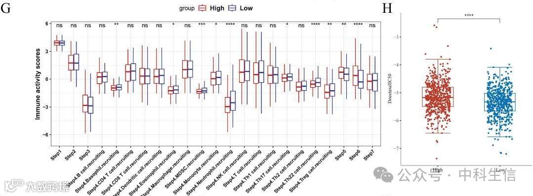 然而,本研究还发现 ASCL1 对免疫应答的影响并不完全一致。例如,在 ASCL1 高表达组中,中性粒细胞的浸润减少,而 Treg 细胞、CD4+ 和 CD8+ T 细胞的浸润增加。通常情况下,中性粒细胞和 Treg 细胞被认为是促进肿瘤进展的细胞,而 CD4+ 和 CD8+ T 细胞则被认为是抑制肿瘤进展的细胞。这些结果似乎表明 ASCL1 介导的肿瘤免疫应答具有双重作用,但可以确定的是,ASCL1 与BC中的免疫细胞浸润密切相关。此外,本研究还评估了 ASCL1 表达水平与免疫反应评分的关系,结果表明 ASCL1 表达水平与BC的免疫反应评分相关(图 4G)。