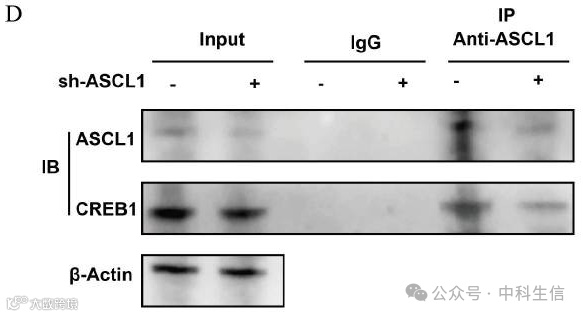 本研究首先进行蛋白分子对接实验,分析 ASCL1 与 CREB1 的结合情况。结果显示,两者之间存在稳定的氢键连接,提示 ASCL1 可能调控 CREB1(图 8B)。免疫荧光实验进一步证实,ASCL1 和 CREB1 在BC细胞中共定位,而 ASCL1 抑制可显著降低这一共定位信号(图 8C)。Co-IP 结果表明 ASCL1 可与 CREB1 结合,且 ASCL1 抑制可促进该复合物的解离(图 8D)。