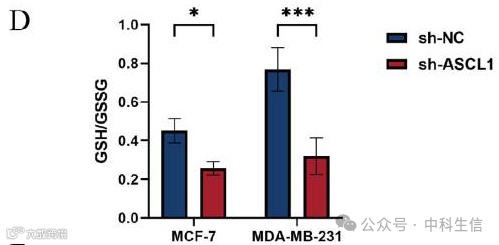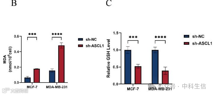 为了验证这一关联,本研究检测了丙二醛(MDA)、活性氧(ROS)、谷胱甘肽(GSH)和氧化型谷胱甘肽(GSSG)等铁死亡标志物的水平。结果发现,ASCL1 抑制可导致 MDA 和 ROS 水平升高,同时 GSH 水平下降,GSH/GSSG 比率降低,这一现象在 sh-ASCL1-MCF-7 和 sh-ASCL1-MDA-MB-231 细胞中均得到验证(图 7B-F)。