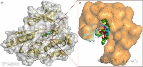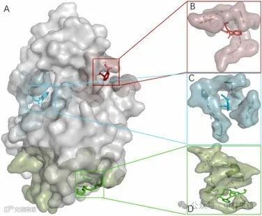 图8:SRC分子对接与增塑剂DEP、DMP和DOP。红色、蓝色和绿色配体分别代表DEP、DMP和DOP。
