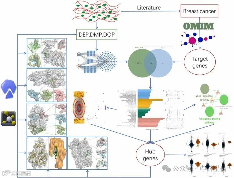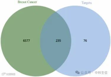 乳腺癌相关靶基因从Genecards和OMIM等数据库下载。然后确定了与乳腺癌相关的靶标与增塑剂的主要化学成分靶标的交集,作为增塑剂诱发乳腺癌的毒性的潜在靶标。