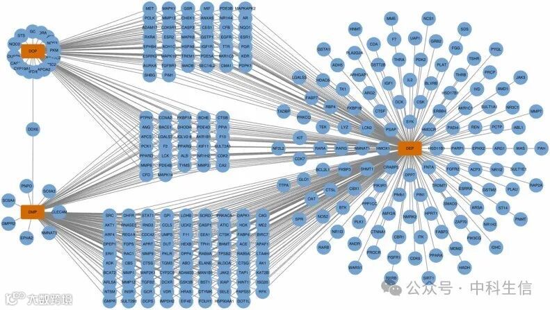 图2:三种化学成分及其靶基因之间的关系图。橙色矩形代表三种化学成分,蓝色圆圈代表其相应的靶基因。