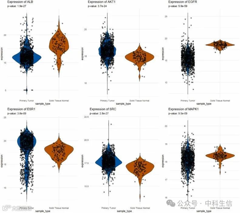 为了定量分析乳腺癌组织中六个关键基因(ALB、AKT1、EGFR、ESR1、SRC、MAPK1)相对于正常对照组织的差异表达,使用来自TCGA乳腺癌队列的RNA-seq FPKM-UQ数据。使用R package ggplot2构建基因表达的小提琴图,以表示不同样品类型中每个基因表达水平的分布。数据处理包括读取标准化基因表达数据和临床表型信息。只有归类为“原发性肿瘤”和“正常实体组织”的数据被保留用于比较,Wilcoxon秩和检验用于评估这两种样本类型之间表达水平的差异。
