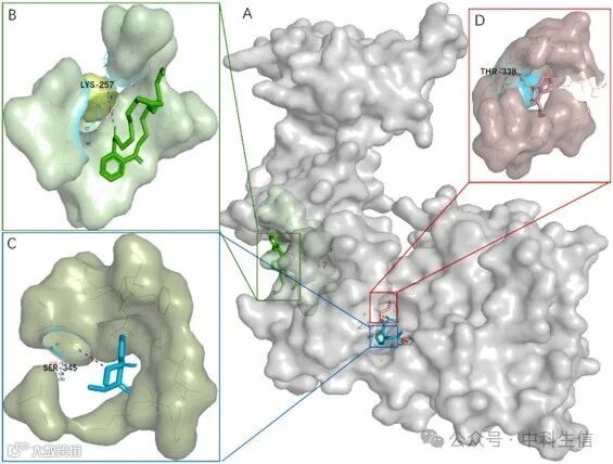AKT1、ESR1、SRC、MAPK1和排名最高的ALB基因分别用三种类型的增塑剂进行了分子对接模拟。最可能的结合构象如图8,11,12所示。红色、蓝色和绿色配体分别代表DEP、DMP和DOP。图8显示了SRC与三种增塑剂的对接结果,揭示了DEP和DMP与SRC上的相同位点结合,特别是与苏氨酸(Thr)和丝氨酸(Ser)残基结合。这可能意味着在分子水平上,DEP和DMP具有相似的潜在生物学效应,而DOP结合到赖氨酸残基上的另一个位点。相互作用包括氢键和疏水相互作用,突出了这些位点的多功能结合性质。ESR蛋白与增塑剂的对接结果如图9所示,其中DEP和DOP结合到相同的位点,而DMP结合到不同的位点。这表明在共同的结合位点存在氢键和可能的π-π堆积相互作用,表明了一种联合作用模式。图10显示了三种增塑剂与MAPK1的对接结果。可以看出,这三种分子与MAPK1上的不同位点结合。结合涉及氢键、疏水相互作用和潜在静电相互作用的组合,表明位点特异性结合特性。