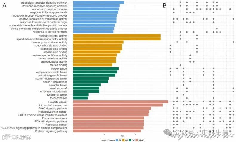 图4:GO和KEGG的富集结果。(A)柱状图显示了与乳腺癌相关基因相关的显著富集的生物过程(BP)、分子功能(MF)、细胞组分(CC)以及KEGG通路。(B)点阵图展示了在富集的GO术语和KEGG通路中排名前20的基因频率。每个点代表相应富集术语中存在的基因。