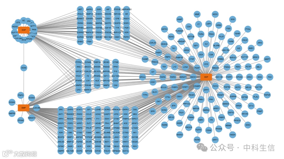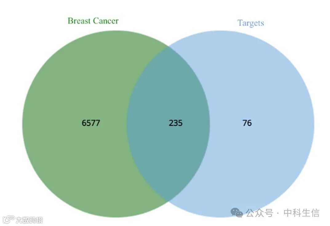 本研究整合处理多个数据库数据,在三种增塑剂中共鉴定出311个独特靶点,其中DEP、DMP、DOP分别靶向288、129、92种靶点,且有32种为三者共有(图1)。这些靶点是增塑剂发挥毒理作用的潜在分子靶标。同时,研究还检索到6812个乳腺癌相关靶基因,与增塑剂靶基因相交得235个基因,即增塑剂诱发乳腺癌的潜在靶点(图2)。