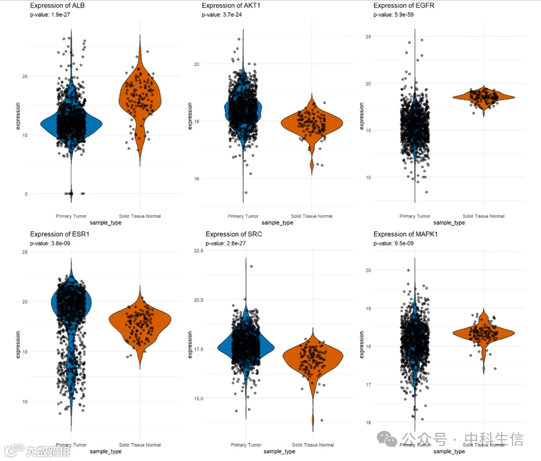 结果如图6所示,表明所有六个基因在原发肿瘤样本和正常组织样本之间的表达水平存在显著差异。值得注意的是,肿瘤组织中ALB和ESR1的表达水平显著降低,而AKT1、EGFR、SRC和MAPK1的表达水平显著上调。这些发现表明,这些基因可能在乳腺癌的发病机制中发挥作用,特定基因在肿瘤条件下表现出一致的下调或上调模式。ALB(p = 1.9e-27)、AKT1 (p = 3.7e-24)、EGFR (p = 5.9e-59)、ESR1 (p = 3.8e09)、SRC (p = 2.8e-27)、MAPK1 (p = 9.5e-09)的p值差异具有统计学意义。基因表达的改变反映了特定的致癌途径,这可能是治疗干预的目标。ALB的下调可能影响激素和药物的转运和生物利用度,而ESR1的下调可能导致雌激素对生长反应的不调节,加速癌症的进展。AKT1和MAPK1的上调表明细胞存活信号增加,可能有助于抵抗凋亡信号。已知的EGFR和SRC在控制细胞生长和分化的信号通路中起作用,可能介导肿瘤细胞的增殖性和侵袭性。这些发现为观察乳腺肿瘤的临床行为提供了分子基础,将基因表达改变与潜在的致病机制和治疗靶点直接联系起来。