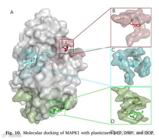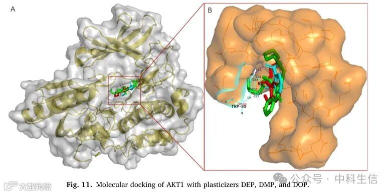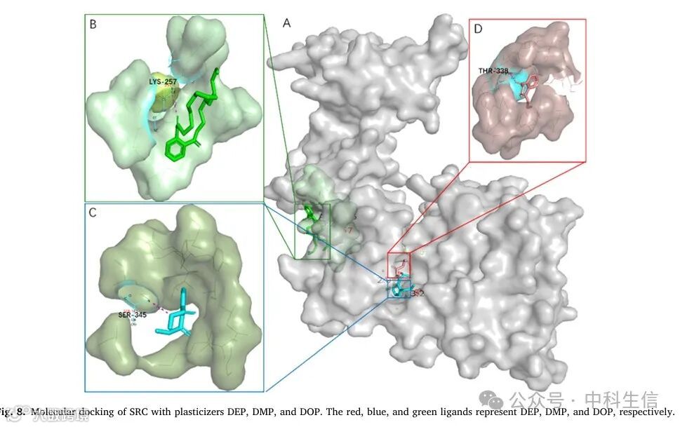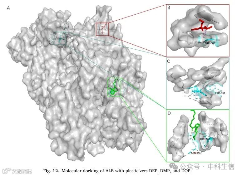对AKT1、ESR1、SRC、MAPK1和ALB基因分别与DEP、DMP、DOP三种增塑剂进行分子对接模拟,结合构象见图7-11。SRC对接中,DEP和DMP结合同一位点,DOP结合另一位点;ESR蛋白对接时,DEP和DOP结合同一位点,DMP结合不同位点;MAPK1对接结果显示三者结合不同位点;AKT1对接表明三种增塑剂结合相同位点;ALB对接发现三种增塑剂与不同的位点结合,但它们都可以通过氢键与ALB相互作用。这表明ALB对不同的增塑剂具有广泛的结合能力,这可能与它作为一种主要的血浆蛋白参与体内各种小分子的运输有关。