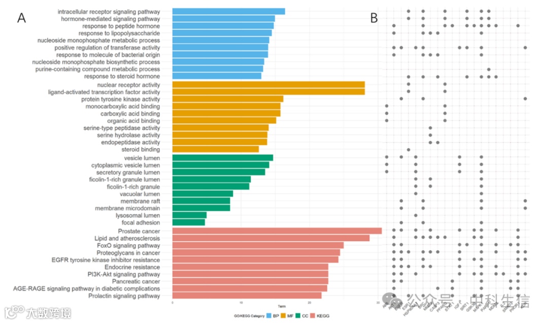 图3展示全面富集分析结果,凸显乳腺癌相关基因主要生物学主题。生物过程中,细胞内受体与激素介导的信号传导途径富集;分子功能分析显示结合活性基因、蛋白酪氨酸激酶活性基因高表达;细胞成分富集集中在细胞质囊泡等;KEGG通路分析表明,PI3K-Akt等癌症相关信号通路显著富集。