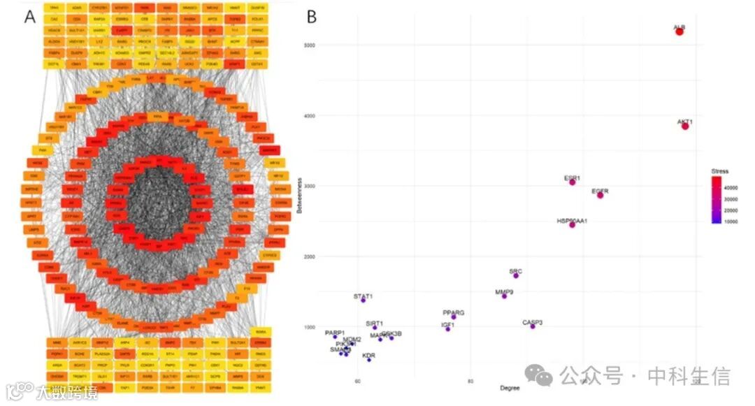 PPI网络显示(图4),节点(基因)按复合中心性度量秩呈同心圆分布,最内圈为前20个基因。用ClueGO等工具对前20个基因网络分析,得出MAPK1, AKT1, SRC和ESR1四个中心基因(图5),关联VEGF等信号通路。加上ALB,共发现五个关键基因。