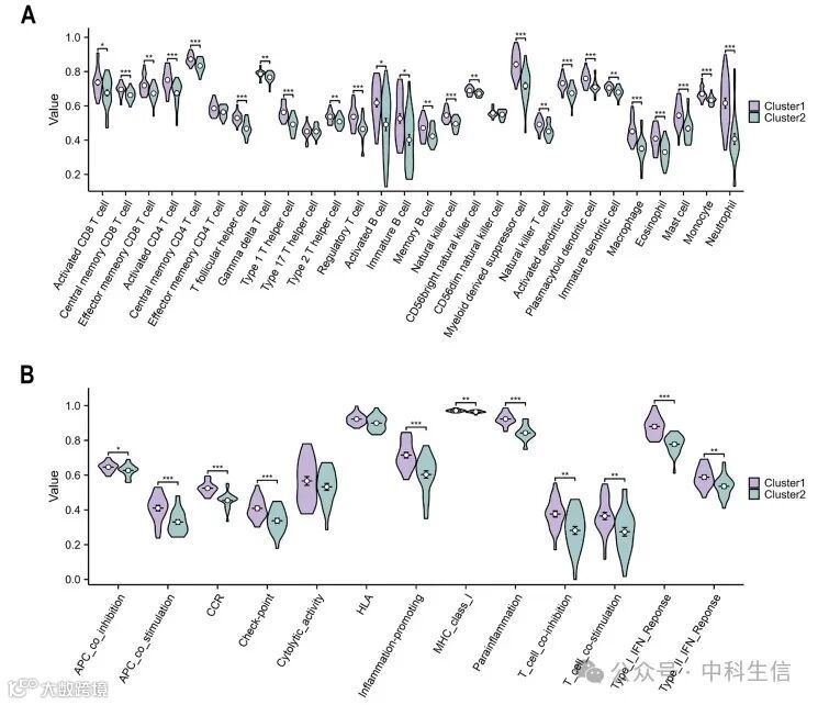 为了阐明两个簇之间的功能差异,进行了功能富集分析。GO分析显示,集簇1中多种免疫相关途径得到增强,包括白细胞迁移、参与免疫反应的白细胞激活、免疫受体活性、巨噬细胞激活和炎症复合物(Fig 6A)。基于KEGG通路分析,TNF信号通路、Toll样受体信号通路和NOD样受体信号通路在簇1中均活跃(Fig 6B)。根据GSEA结果,簇1中的炎症反应、异体组织排斥、间质反应、表皮间质转化和TNFA信号转导水平升高,而簇2中的脂肪酸代谢和氧化磷酸化水平都有所提高(Fig 6C-D)。