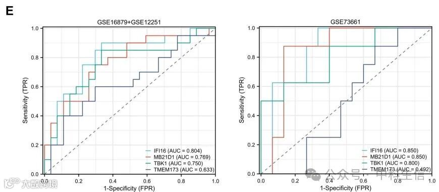 接下来,选择了三个数据集(GSE16879、GSE12251和GSE73661)提供了接受抗TNF治疗的UC患者的数据。在抗TNF治疗开始时检查了应答者和非应答者中hub基因的表达。研究发现,无应答者的IFI16、MB21D1(CGAS)和TBK1表达水平高于应答者(Fig 3A-B)。发现抗TNF治疗可降低大多数应答者中IFI16和TMEM173 (STING)的表达(Fig 3C-D)。同时,IFI16的预测值最高,IFI16的AUC达到0.804和0.850(Fig 3E)。