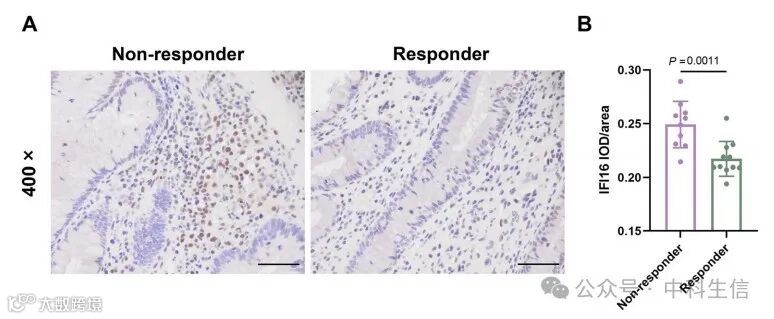 结果表明,不良的抗TNF治疗结果与高水平的cGAS-STING通路相关,而IFI16是该临床治疗决策的一个有前途的预测生物标志物。作者还收集了21名UC患者的结肠组织样本,以研究英夫利昔单抗应答者和无应答者之间IFI16表达的变化。有反应者和无反应者的基线特征见表1。免疫组织化学染色结果显示,与应答者相比,无应答者的IFI16表达水平更高(Fig 4A-B)。
