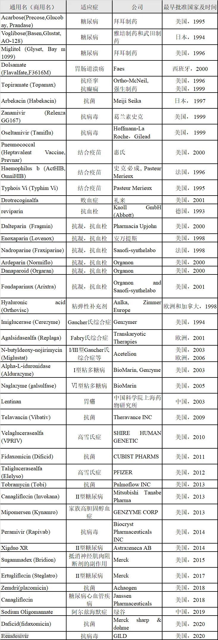表1. 国内外部分临床批准药物