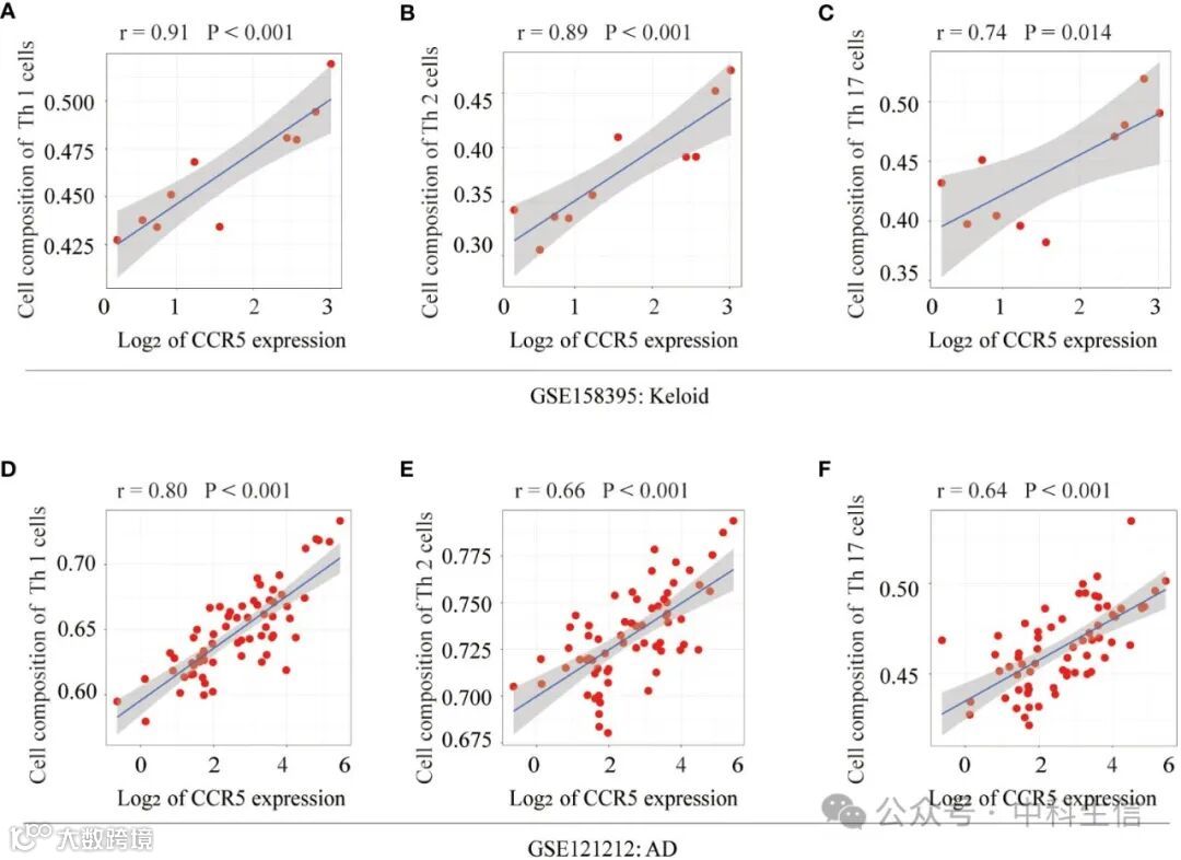 关键基因CCR5与T辅助细胞(Th细胞)的相关性分析。在瘢痕疙瘩组织中,CCR5表达水平与(A) Th1细胞(r=0.91,P<0.001)、(B) Th2细胞(r=0.89,P<0.001)、(C) Th17细胞(r=0.74,P=0.014)的相关性分析及散点图。在特应性皮炎(AD)组织中,CCR5表达水平与(D) Th1细胞(r=0.80,P<0.001)、(E) Th2细胞(r=0.66,P<0.001)、(F) Th17细胞(r=0.64,P<0.001)的相关性分析及散点图。