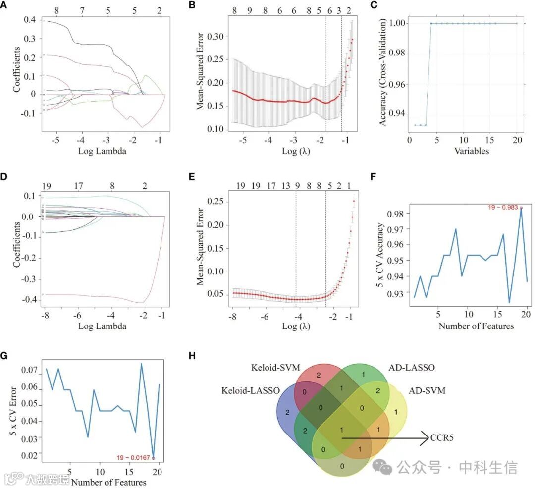 利用机器学习方法识别瘢痕疙瘩与特应性皮炎(AD)中的关键基因。使用来自GSE158395数据集的LASSO分析(A,B)和支持向量机递归特征消除(SVM-RFE)算法(C)鉴定瘢痕疙瘩的核心基因。使用来自GSE121212数据集的LASSO(D,E)和SVM-RFE算法(F,G)鉴定AD的核心基因。(H) 文氏图展示了在瘢痕疙瘩和AD数据集中,通过LASSO回归分析和SVM-RFE算法筛选出的重叠核心基因。