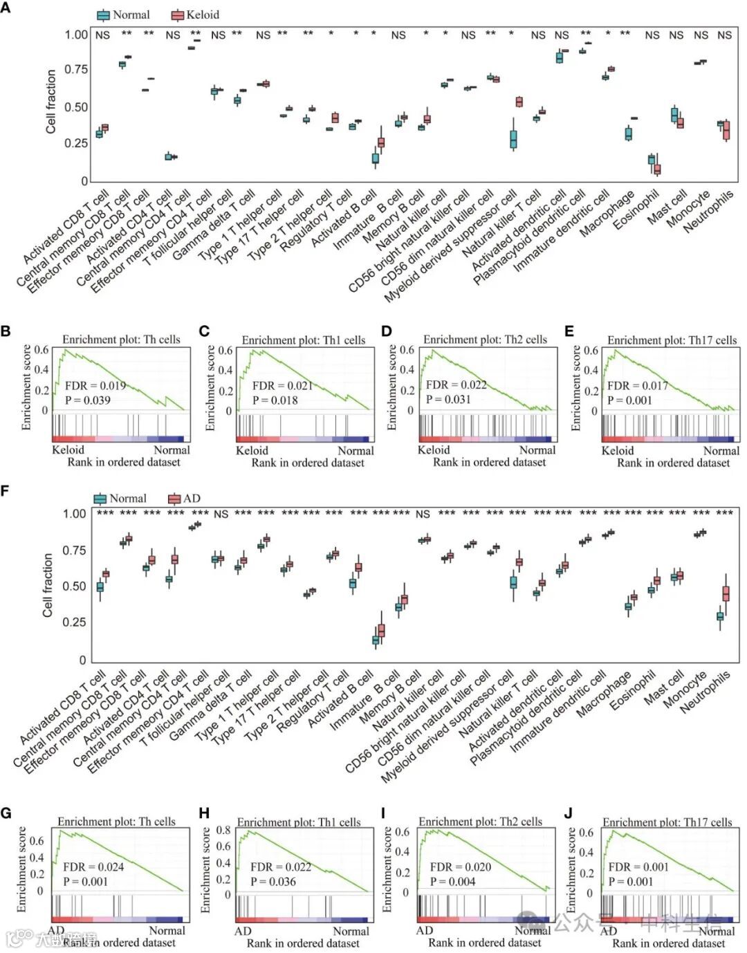瘢痕疙瘩与特应性皮炎(AD)数据集中免疫细胞浸润的分析。(A) 瘢痕疙瘩数据集(GSE158395)中每个样本28种免疫细胞的相对百分比。基因集富集分析(GSEA)揭示了瘢痕疙瘩数据集样本中富集的细胞类型:(B) T辅助细胞(Th细胞),(C) Th1细胞,(D) Th2细胞,(E) Th17细胞。(F) AD数据集(GSE121212)中每个样本28种免疫细胞的相对百分比。GSEA揭示了AD数据集样本中富集的细胞类型:(G) Th细胞,(H) Th1细胞,(I) Th2细胞,(J) Th17细胞。