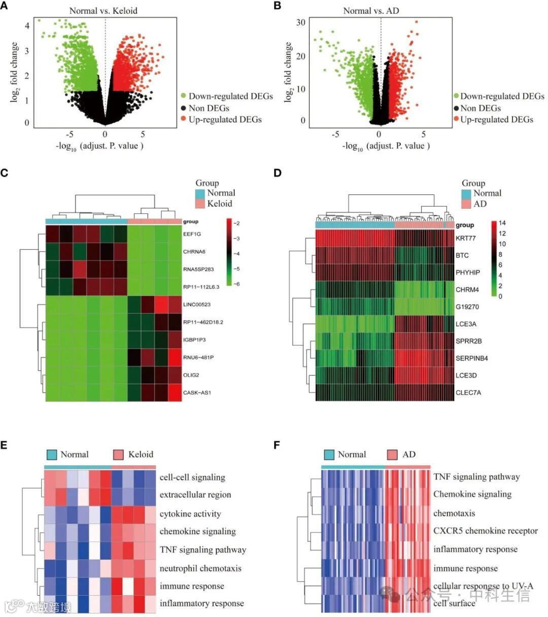 瘢痕疙瘩与特应性皮炎(AD)的差异表达分析及通路富集注释。(A) 火山图展示了瘢痕疙瘩与对照组之间的差异表达基因(DEGs)。绿色点代表下调基因,红色点代表上调基因。(B) 火山图展示了AD与对照组之间的差异表达基因。(C) 热图展示了在瘢痕疙瘩样本中显著表达的前10个差异表达基因。(D) 热图展示了在AD样本中显著表达的前10个差异表达基因。(E) 瘢痕疙瘩样本中基因集变异分析(GSVA)富集分析的热图。(F) AD样本中基因集变异分析(GSVA)富集分析的热图。