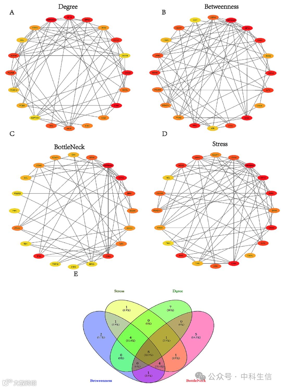 基于807个交集基因构建了PPI网络。利用CytoNCA插件分析网络拓扑结构并识别其中的核心基因。采用四种算法计算交集基因的连通度。选取每种算法中排名前20的基因(图 4A-D)。对这4种算法的结果取交集,确定了8个hub基因,即HSP90AA1、CD8A、HIF1A、CXCL8、EPRS1、POLR2B、TFRC和PTGS2(图 4E)。