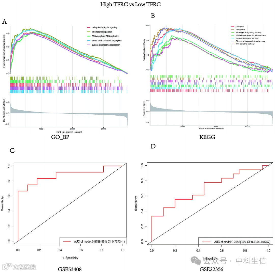 GSEA(图 6A-B)显示,在TFRC高表达PAH样本中,大多数基因在以下生物学过程中富集:细胞周期检查点信号传导、染色体分离、模板依赖性DNA复制、有丝分裂姐妹染色单体分离以及核染色体分离。由于细胞增殖和炎症浸润是PAH发病机制的特征,功能和通路富集分析均表明TFRC在PAH发病过程中具有潜在作用。在验证数据集中使用受试者工作特征曲线(ROC),进一步验证目标基因的诊断效能,在GSE53408和GSE22356中,TFRC呈上调状态,其曲线下面积(AUC)分别达到0.8788(图 6C)和0.7056(图 6D),表明TFRC的表达水平能够区分PAH患者和健康对照。