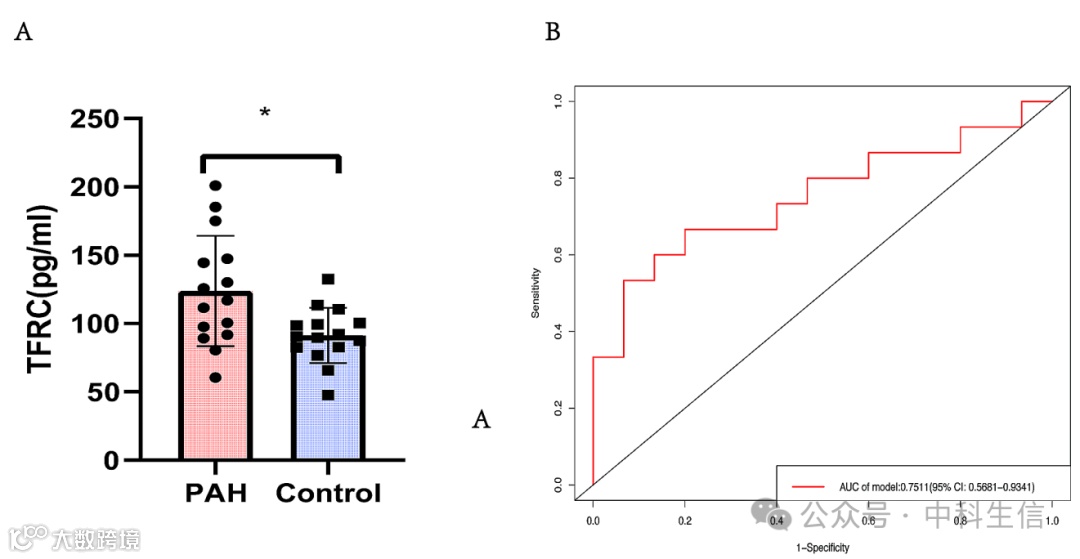 基于上述生物信息学分析和实验验证,发现TFRC是唯一一个在PAH组中表达持续上调的靶基因。因此,选择TFRC进行进一步的实验验证。首先,收集了15名特发性肺动脉高压(IPAH)患者和15名健康对照者的血液样本,以测定血清TFRC浓度。IPAH患者的血清TFRC浓度显著高于健康对照者(图 8A)。使用ROC曲线分析评估TFRC水平对PAH的诊断能力,结果显示AUC值为0.7511,表明TFRC作为诊断生物标志物具有较高的预测效率(图 8B)。