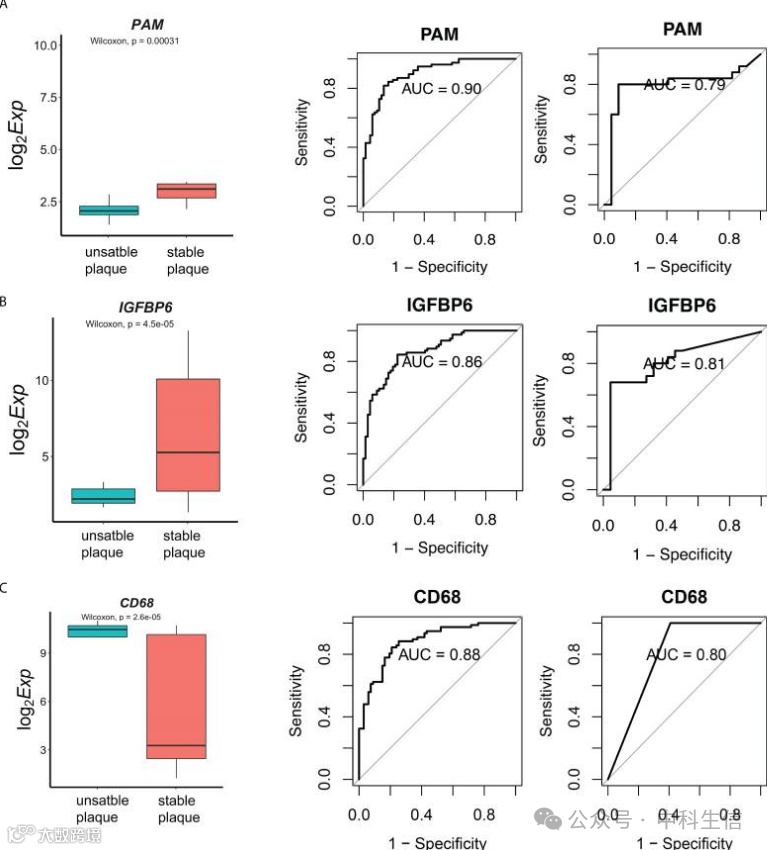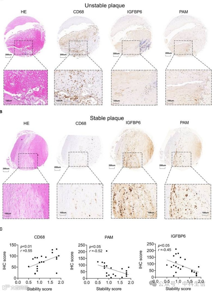 为了进一步验证这些基因对于不稳定斑块的诊断效用,收集了动脉粥样硬化样本,并根据 AHA动脉粥样硬化评分系统进行评分(补充表3)。与测序数据一致,CD68在不稳定斑块中高表达,在稳定斑块中下调;PAM和IGFBP6在不稳定斑块中减少,在稳定斑块中增加 (图 7A、B)。CD68与稳定性评分显著正相关,PAM和IGFBP6与稳定性评分显著负相关(图7C)。因此,这三个基因可以作为不稳定斑块的可靠诊断预测因子——生物标志物。