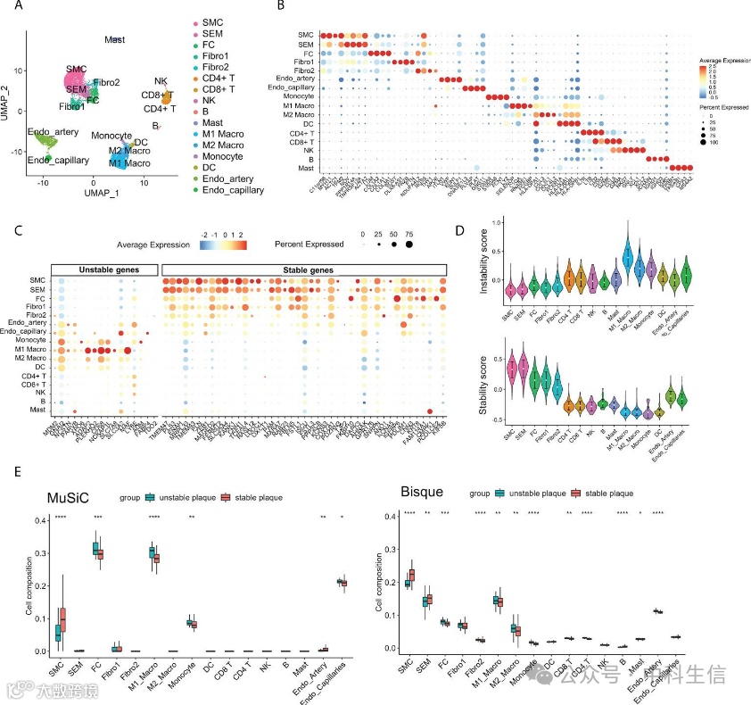 为了进一步验证不稳定斑块的免疫浸润,应用MuSiC和Bisque根据scRNA-seq标记基因对细胞组成进行去卷积。结果表明,不稳定斑块中髓样细胞(尤其是M1巨噬细胞)和FC细胞也升高,SMC和SEM在不稳定斑块中下调(图4E)。这些发现表明,SMC的丢失和巨噬细胞亚群的浸润,尤其是M1巨噬细胞,是导致斑块不稳定的最重要危险因素。
