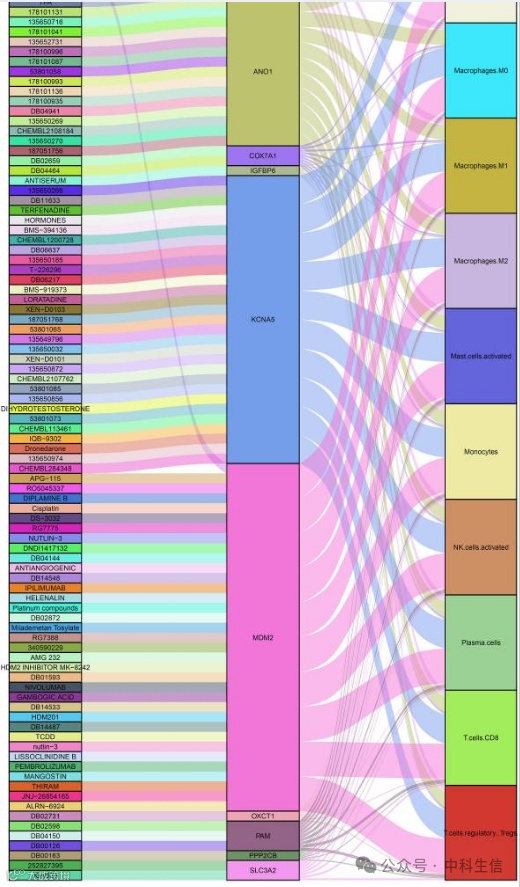 基于核心基因,利用基因-药物相互作用数据的DGIdb数据库(https://www.dgidb.org/)识别潜在的治疗药物,采用桑基图描绘药物、基因和免疫细胞之间的相互作用。