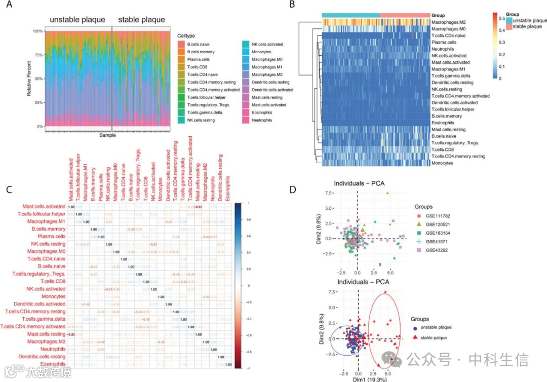 图1:不稳定和稳定的斑块中的免疫细胞浸润情况。(A)堆叠图显示了样本中22种免疫细胞的组成。(B)22种免疫细胞在样本中的组成热图,按归一化相对丰度着色。(C)破裂斑块样本中22种免疫细胞的相关性热图。蓝色表示正相关,红色表示负相关。(D)免疫细胞浸润的主成分分析图,按数据集(上图)和斑块稳定性(下图)着色。
