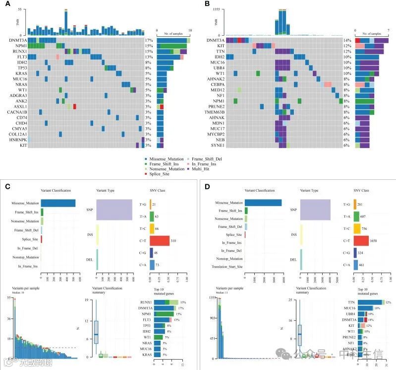 随后,比较了两个风险组之间的突变模式。结果表明,高危组发生突变的样本高于低风险组,并且高危组已知的AML高危分子突变明显更多(图 8)。