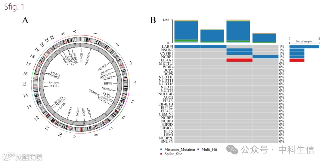 在检索了之前的研究后,选择了29个m7G相关基因,包括AGO2、CYFIP1、DCP2、DCPS、EIF3D、EIF4A1、EIF4E、EIF4E1B、EIF4E2、EIF4E3、EIF4G3、GEMIN5、IFIT5、LARP1、LSM1、METTL1、NCBP1、NCPP2、NCBP2L、NCBP3、NSUN2、NUDT10、NUDT11、NUDT16、NUDT3、NUDT4、NUDT4B、SNUPN和WDR4。这些基因在染色体上的分布如补充图1A所示。体细胞突变分析显示,AML样本中的大多数基因没有突变(补充图1B)。