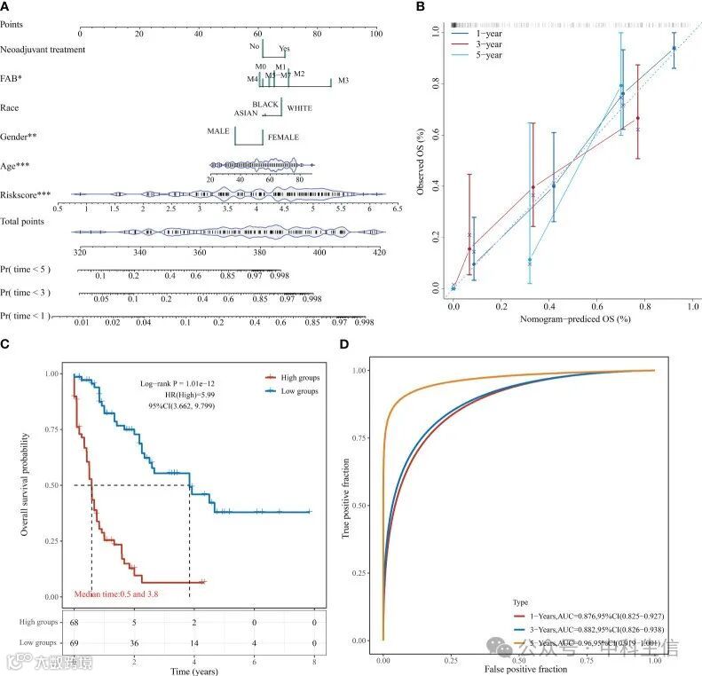基于上述回归分析,我们开发了一个列线图,为临床医生提供了一种定量的预测方法。为每位患者的每个预后参数获得一个评分,并且可以使用得到的总分 (图 6A)。此外,校准图曲线还显示,列线图比理想模型具有更好的预测函数 (图 6B)。根据列线图模型评分、中位数和绘制的KM曲线将样本进一步分为高低风险组,由此可见高低风险组的OS存在显著差异(log-rank p < 0.0001,HR = 5.99),其中68个样本被归类为高风险,69个样本被归类为低风险(图 6C)。ROC分析用于验证1、3和5年预后预测的列线图的分类效率,从中可以看出,列线图评分模型在AUC线下有很高的面积,1、3、5年的AUC高于0.876(图6D)。