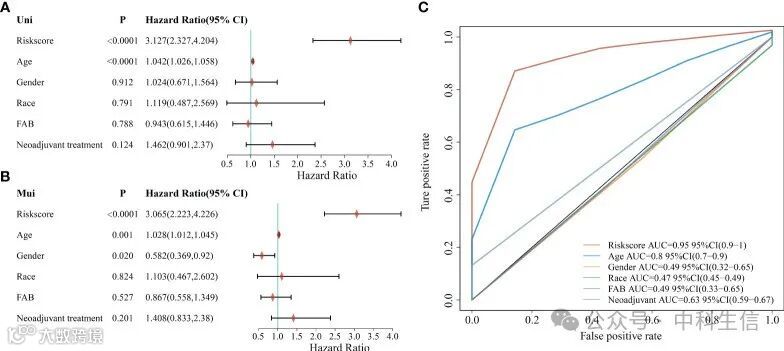 为进一步探讨预后风险评分模型的临床价值,对 TCGA 队列进行了单变量和多变量Cox回归分析。在单变量Cox分析中,年龄和风险评分与AML患者的预后显著相关(图 5A)。此外,多因素Cox回归结果表明,年龄和风险评分是 AML患者预后的独立危险因素(图 5B)。接下来,我们对这些因素进行了ROC 分析,AUC值的结果表明,风险评分在预测OS方面的准确性高于年龄风险因素(图 5C)。