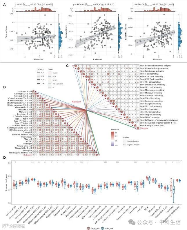 之前的研究表明,基于m7G相关聚类的生存差异可能与各组的免疫浸润和肿瘤纯度有关。在这里,使用R软件“estimate”包进一步分析了风险评分和免疫细胞评分之间的关系。结果显示,免疫评分和基质评分与风险模型呈显著正相关,相关系数分别为0.39和0.27(图7A)。这也表明风险模型表达与肿瘤免疫之间存在联系。它还进一步表明了风险模型与细胞免疫之间的关系。抗癌免疫反应可以被概念化为一系列被称为癌症免疫循环的逐步事件,包括癌症细胞抗原的释放(步骤1)、癌症抗原呈递(步骤2)、启动和激活(步骤3)、免疫细胞向肿瘤的转运(步骤4)、免疫单元向肿瘤的渗透(步骤5)、T细胞识别癌症细胞(步骤6)和杀死癌症细胞(步骤7)。在此,通过追踪肿瘤免疫表型(TIP)网站分析获得7步结果矩阵,并类似地分析了风险模型与7步抗癌免疫反应的相关性。结果显示,Step2、Step4 T细胞募集、Step4 CD4 T细胞募集和Step4 CD8 T细胞募集与Step4 Th1细胞募集、Step4 Th22细胞募集、Step4 NK细胞募集和Step5免疫细胞浸润与风险模型呈正相关,而Step4单核细胞募集与风险模型呈负相关(图7C)。ssGSEA算法进一步用于鉴定28个TIL亚群,包括与适应性免疫相关的主要类型:活化T细胞、Tcm、TemCD4和CD8 T细胞、Tγδ细胞、Th1、Th2、Th17、调节性T细胞、滤泡T细胞、活化B细胞、未成熟B细胞和记忆性B细胞;以及与先天免疫类型相关的细胞,如巨噬细胞、单核细胞、肥大细胞、嗜酸性粒细胞、中性粒细胞、活化DC、浆细胞样和未成熟DC、NK细胞、NKT细胞和MDSC(图7B)。结果显示,风险模型与28个TIL亚群中的绝大多数呈显著正相关(图7D)。