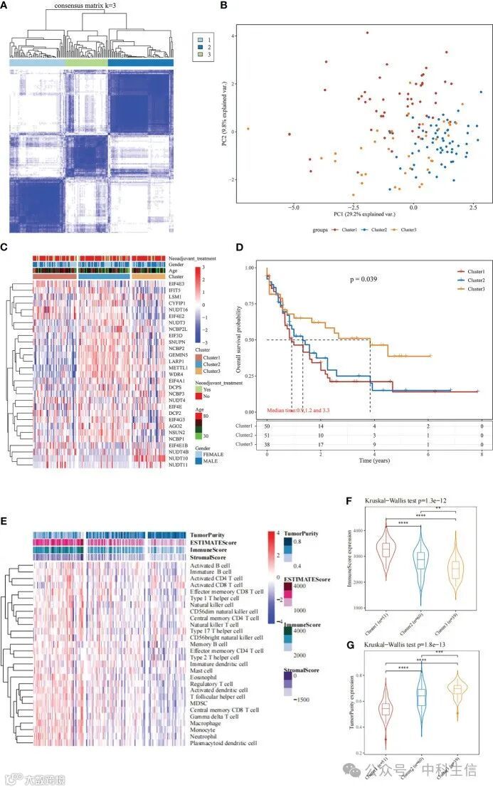 基于29个m7G相关基因的表达相似性,通过应用共识聚类对TCGA数据进行聚类。150个AML样本可以很好地分为3个聚类(图1A、B),即聚类1(n=51)、聚类2(n=60)和聚类3(n=39)。m7G相关基因在簇2中的表达明显高于其他两组(图1C)。此外,Kaplan-Meier生存分析的进一步应用表明,在总生存期(OS)方面,与第3组相比,第1组和第2组的预后较差(图1D)。