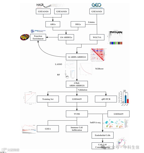 从基因表达综合数据库(GEO)获取对照组和 ARDS 组的基因表达谱,从人类衰老基因组资源(HAGR)数据库获取衰老相关基因(ARGs)。对差异表达基因(DEGs)进行功能富集分析,以了解其在 ARDS 和衰老中的作用。加权基因共表达网络分析(WGCNA)和机器学习精确定位了关键模块和标记基因,ROC 曲线说明了它们的重要性。采用 qRT-PCR 方法检测老年 ARDS 小鼠肺组织中四种 ARDS-ARDEGs 的表达。基因组富集分析(GSEA)研究了与 TYMS 表达相关的信号通路和免疫细胞浸润。单核 RNA 测序(snRNA-Seq)探讨了细胞间的基因水平差异,以研究 ARDS 发病和进展过程中的细胞间通讯。