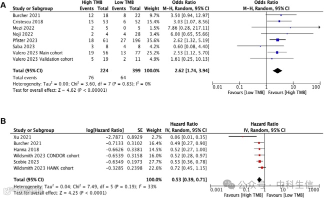使用随机效应模型评估了7项研究(8个队列)对ICI治疗的汇总ORR进行了评估,涉及623例患者。高 TMB 患者组表现出更高的 ORR(OR = 2.62,95% CI 1.74–3.94,p < 0.0001)。