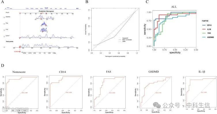 利用rms软件包构建了特征基因(CD14、GSDMD、IL1β 和 FAS)的诊断列线图(图 4A),并利用校准曲线评估了其预测效果。校准曲线的结果显示,模型的预测概率与实际概率相当一致,表明模型相当准确(图 4B)。此外,ROC 曲线分析也可用于评估预测的正确性。nomoscore、CD14、FAS、GSDMD 和 IL1β 的ROC曲线的AUC分别为 0.957、0.932、0.823、0.791和0.900,表明这些特征基因在模型中具有很高的诊断效率(图 4C和D)。