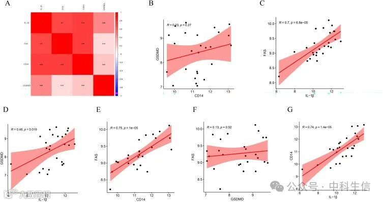 为了进一步确定对照组和SLI组之间四个特征基因的表达水平,进行了差异分析,结果发现这些特征基因在SLI组中高表达(p < 0.05)(图 6A-D)。热图和相关系数散点图的结果表明,FAS和CD14(r = 0.75,p < 1e-0. 5)、CD14和IL1β(r = 0.74,p < 1.4e-0.5)、FAS和IL1β(r = 0.7,p < 6.1e-0.5)呈正相关,表明特征基因CD14、FAS和IL1β在SLI中可能具有显著相似的特征(图7A-G)。
